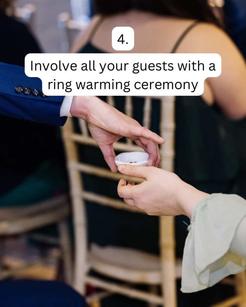 Involve all your guests by having a ring warming ceremony. Your wedding rings are passed around your guests in a bowl for them to “warm them” with their good wishes and love for your married life.