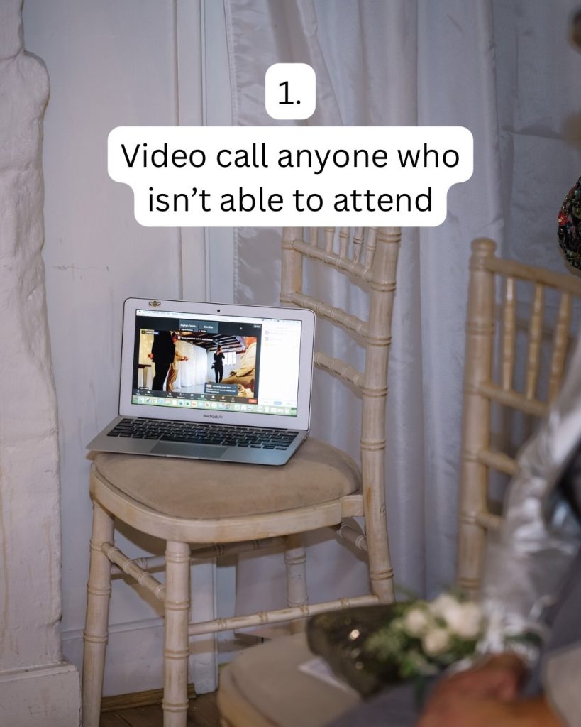 Set up a laptop on a free chair and video call friends and family who aren’t able to make it, they get a front row seat to your unique ceremony. (Make sure you create a meeting and send the invites ahead of the day)