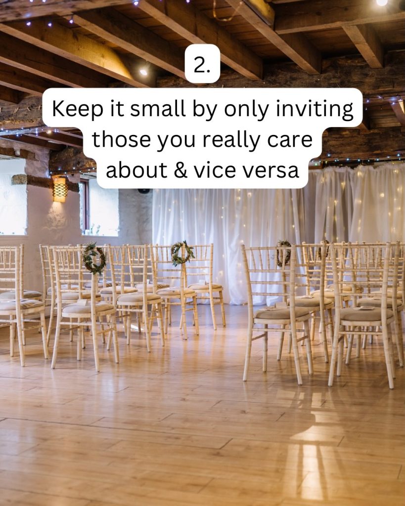 Keeping your wedding ceremony small means it feels intimate and intentional however the most important thing regardless of the size of your guest list is to ONLY invite those you really care about and vice versa.