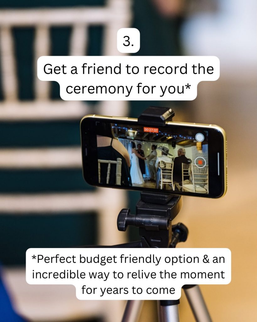 Rope a friend in to record the ceremony for you. All you need is a tripod and camera phone, they don’t even need to hold it, just position it at the end of the aisle. This budget friendly option saves a ton on a videographer and allows you to watch back your ceremony whenever you want! Bonus tip: upload on YouTube and share with friends and family who couldn’t make the ceremony.